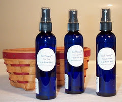 Room Mists come in 4oz colbalt blue glass bottles. Room Mists can be sprayed in the room, on you, on a cloth or tissue. Do not spray on wood surfaces. Do not breath in the mist directly. Tea Tree and Woodsy are also natural flea sprays. Do not spray directly on your pet. Spray a small amount on a cloth and gently rub on your pet. Test in a small area for reactions. Discontinue use if reaction occurs and consult physician. Do not use on cats.